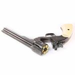 Pesando um pouco mais de 1kg, o Schofield é feito todo em metal e com a empunhadura em polímero imitando marfim.