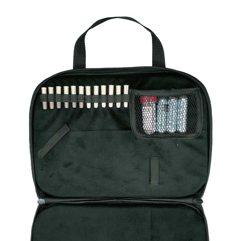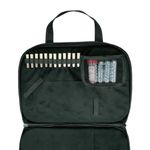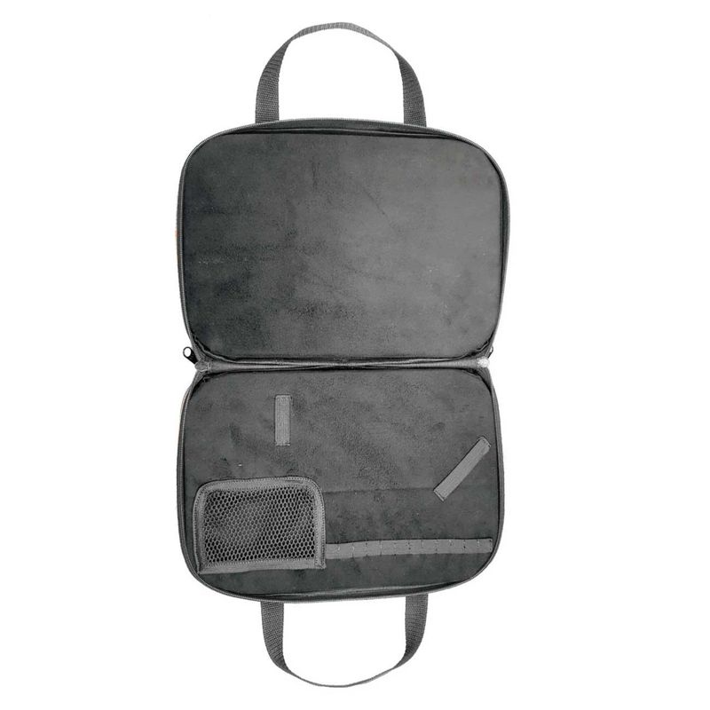 Além dos compartimentos internos, o estojo oferece um bolso externo para colocação de acessórios, cargas e munições.