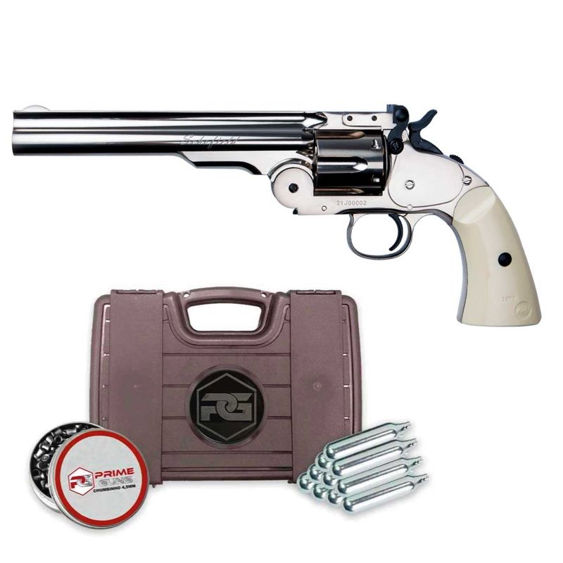 O revólver Schofield Silver de chumbinho é uma réplica fiel do famoso revólver Schofield, usado durante o Velho Oeste americano. Ele é alimentado por cápsulas de CO2 de 12g, que são inseridas no grip do revólver. O tambor tem capacidade para 6 tiros de chumbinho de 4,5mm.