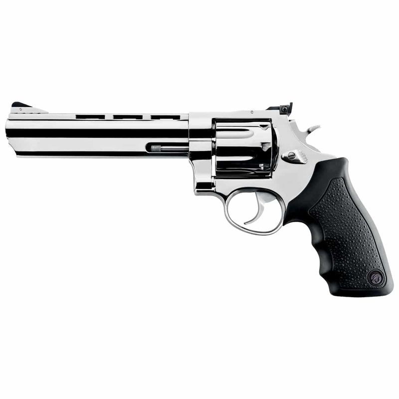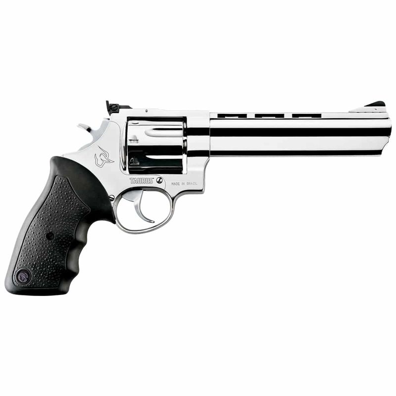 A alça de mira é ajustável, o Revólver Taurus RT 608 Inox Alto Brilho é um revólver de ação simples / dupla com capacidade para 8 cartuchos.