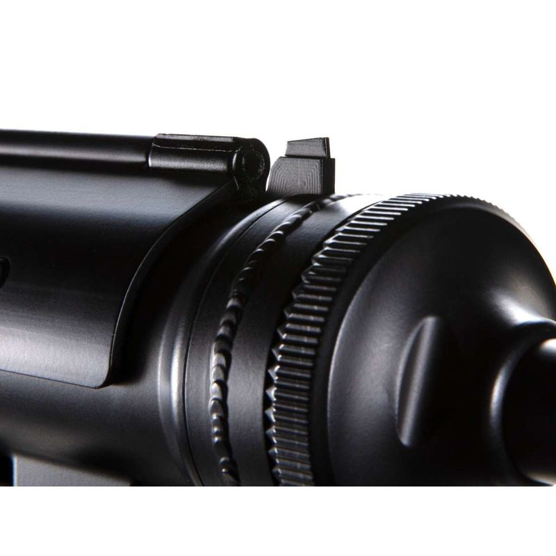 O airgun inclui uma mira traseira estilo peep e uma mira frontal fixa, ambas presentes na versão original de munição convencional.