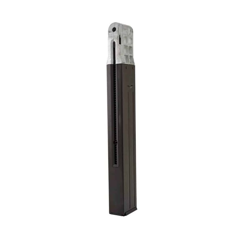 Possui capacidade para 50 esferas de aço, que podem ser disparadas na função Semi Auto, com um magazine realista que utiliza 2 cilindros de CO2.
