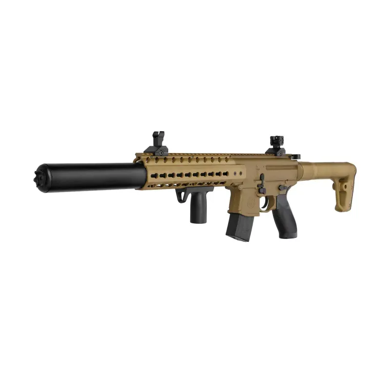 A carabina de ar comprimido Sig Sauer MCX TAN CO2 vem em um calibre diábolo 4,5mm (.177) e tem um corpo de metal e polímero. Graças ao inovador magazine de 30 tiros, é ideal para um treino plinking rápido e preciso.