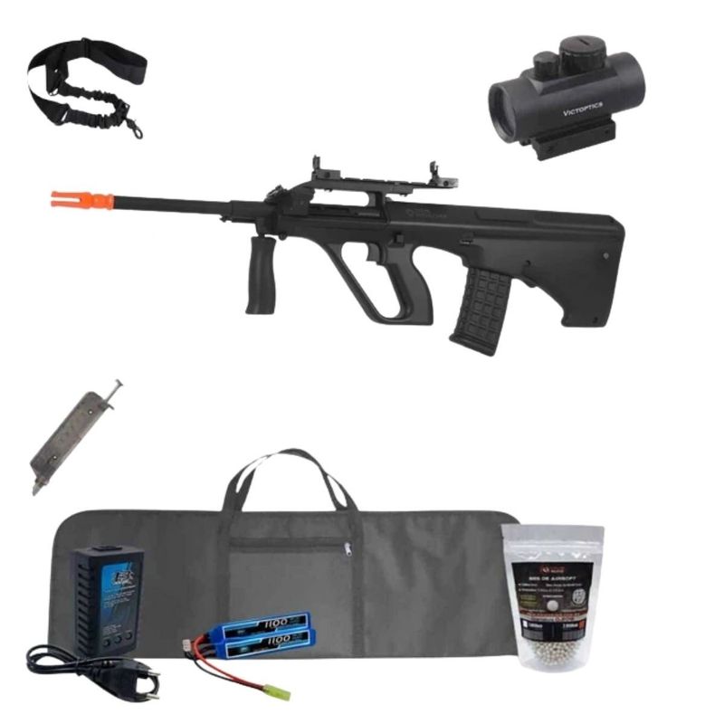 O Rifle Airsoft Steyr AUG A2 Elétrica NBB 6mm Super Kit dispara no modo Semi e Full Automática com velocidade de 295fps - 90m/s e energia de 0,81 Joules Ver mais
