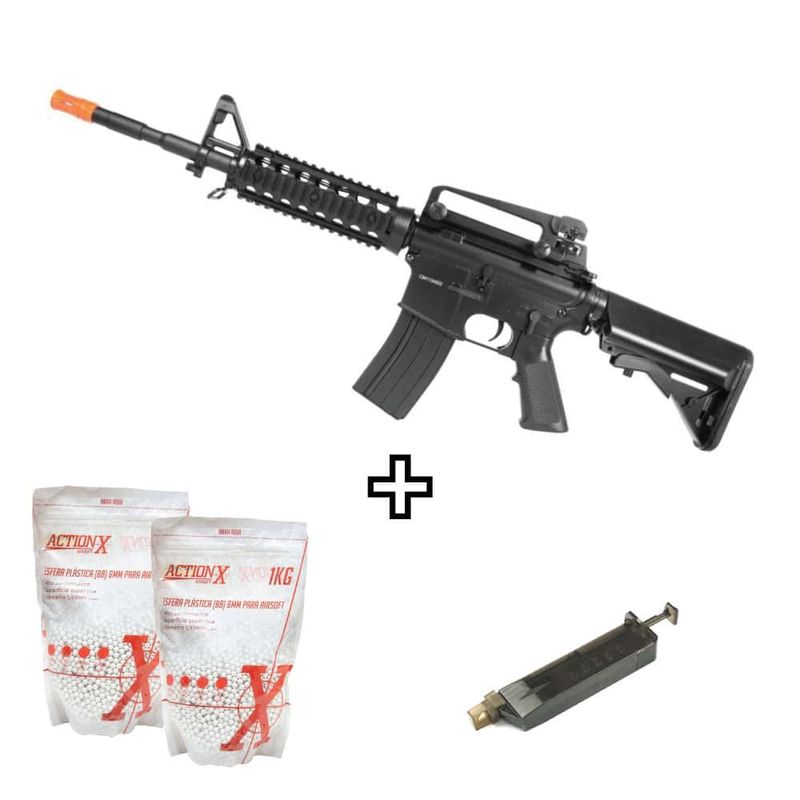 O Rifle Airsoft Cyma M4A1 Ris Cm507 Elétrico 6mm Kit dispara no modo Semi e Full Automática com velocidade de 420fps - 128m/s e energia de 2,1 Joules Ver mais