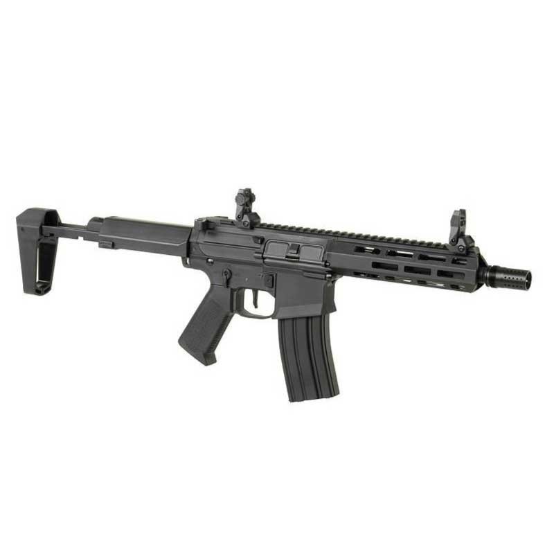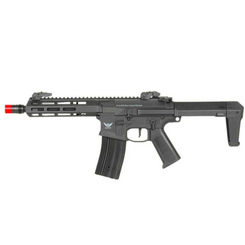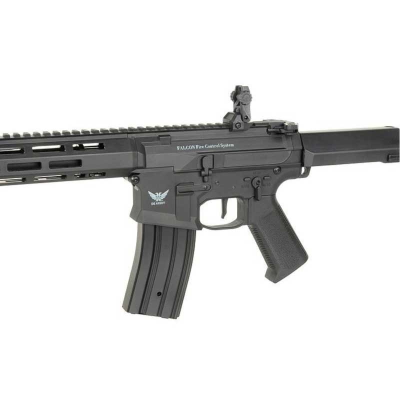 Mecanismo da caixa de engrenagens V2 com um sistema de troca rápida de mola montado em rolamentos de esferas de aço de 8mm e HopUp rotativo. Além disso, como padrão, essas réplicas são equipadas com um sistema de controle eletrônico Falcon com modo de disparo programável (Double Shot no modo SEMI ou 1-5 Round Burst no modo AUTO), ajuste de sensibilidade do gatilho (3 modos) e proteção do motor e bateria.