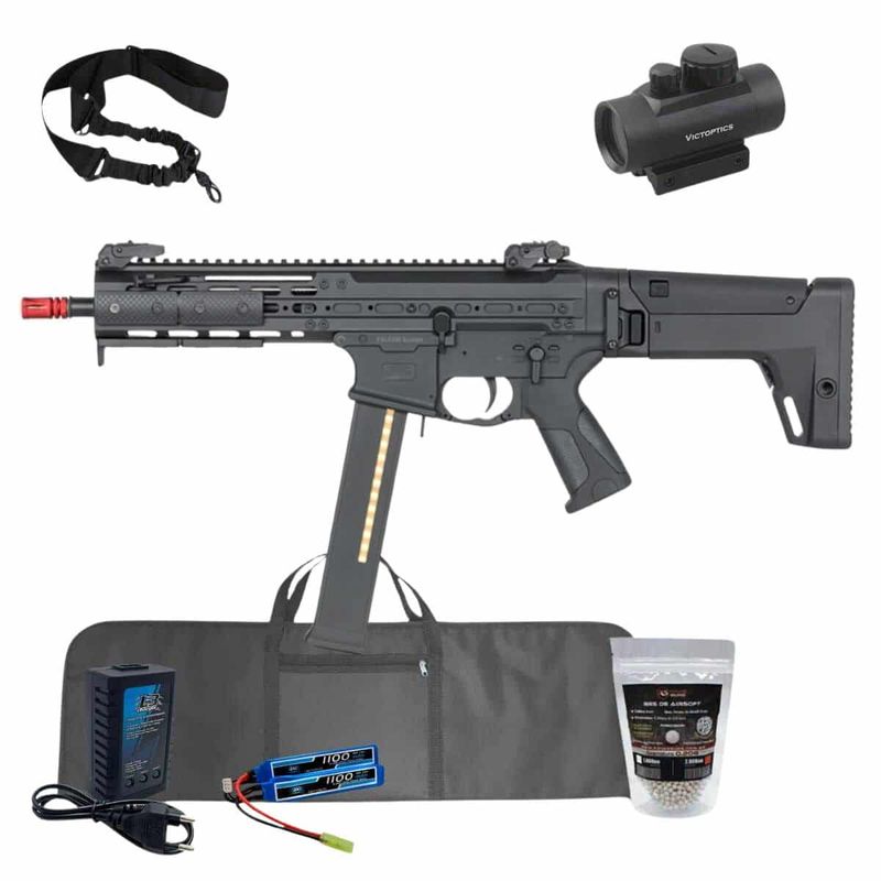 + Carregador B3 + 2.000 BBs de Airsoft + Bateria Lipo 7.4 1100mAh + Capa com forro + Red Dot 1×35 + Bandoleira de 1 ponta