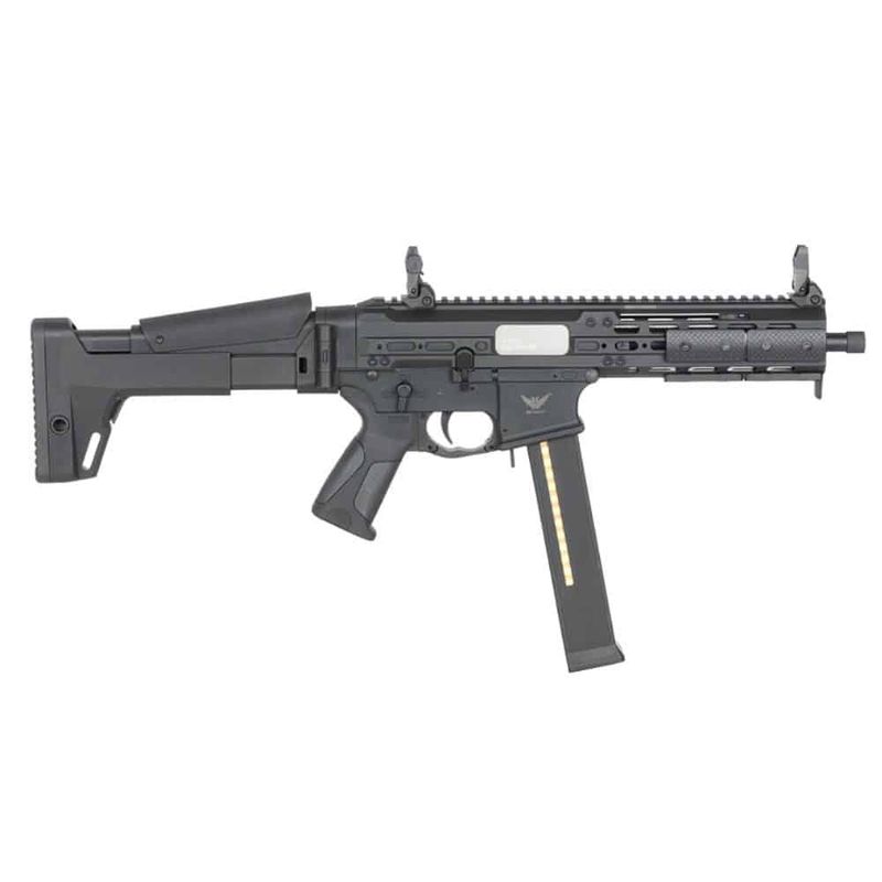 Fabricado com fibra de nylon reforçada de alta durabilidade na cor preta, o rifle pesa 2,5kg, proporcionando equilíbrio e facilidade de manuseio, mesmo em jogos prolongados. Sua coronha rebatível e ajustável oferece maior mobilidade, podendo ser compactado para jogos de CQB ou estendido para maior estabilidade em distâncias mais longas.