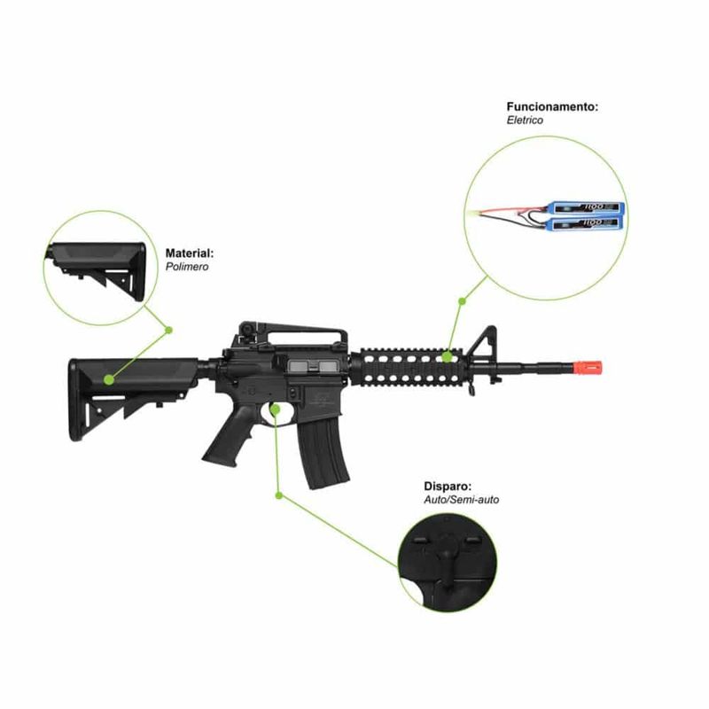 O Rifle Airsoft Elétrico M4 Yankee S-1 6mm QGK dispara no modo Semi e Full Automática com velocidade de 300fps - 91m/s e energia de 0,8 Joules Ver mais