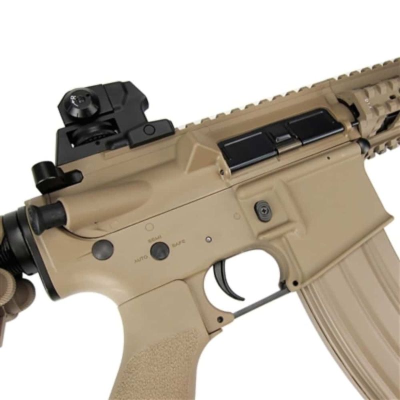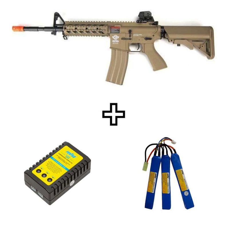 O Rifle Airsoft G&G CM16 Raider L Desert Elétrico AEG 6mm Kit dispara no modo Semi e Full Automática com velocidade de 380fps - 115m/s e energia de 1 Joules Ver mais