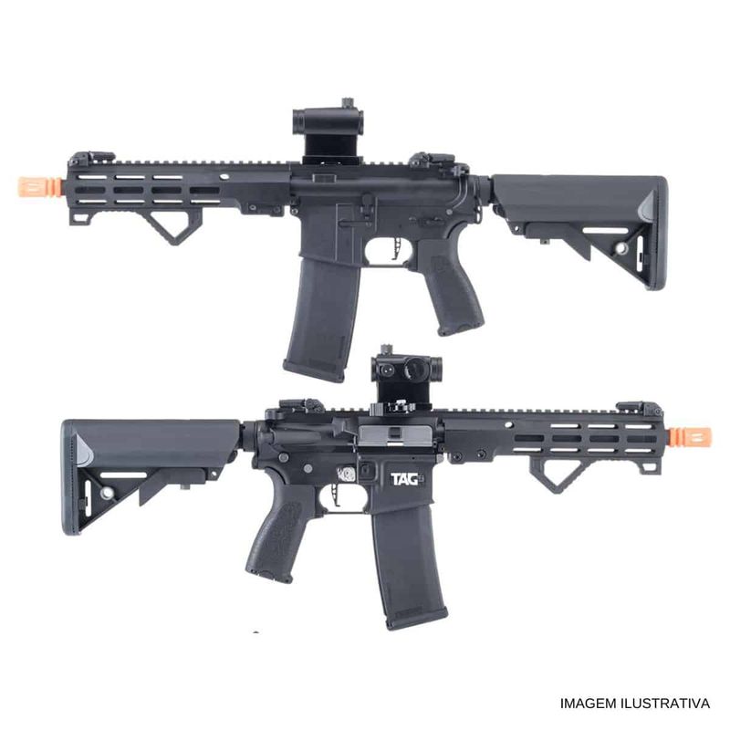 A linha TAG acompanha dois magazines Mid Cap de 100 BBs cada. O rifle aceita qualquer magazine Low, Mid ou High Cap.