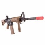 O M4 Black/Tan SA-CO3 possui o flash hider em metal vermelho, oferecendo ainda mais beleza no acabamento da arma, além claro, de ser obrigatório em armas de airsoft, que precisam da ponta laranja ou vermelho, conforme a legislação vigente.