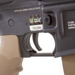 O rifle M4 SAC03 Black/Tan possui modo de disparo Semiautomático e full automático, podendo alterar através da chave seletora de tiro no later da arma, além da trava de segurança, também na mesma posição.