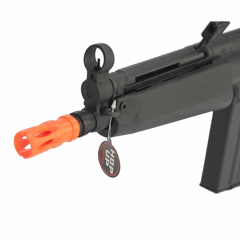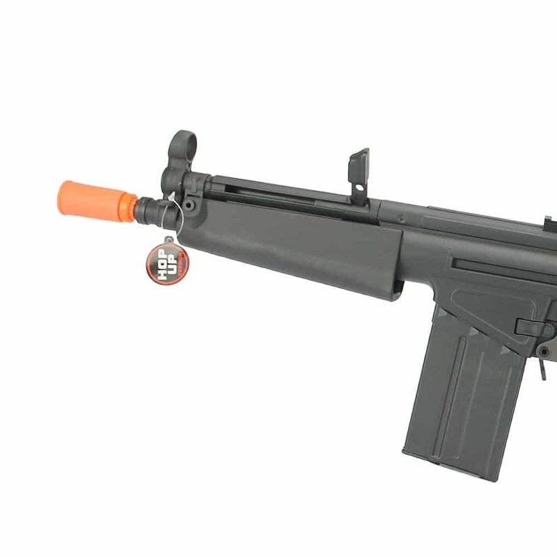 Com sistema de Hop-Up ajustável, massa de mira fixa e alça ajustável, coronha com regulagens de tamanho e sistema de trilhos, este é um rifle de airsoft com recursos completos para qualquer operador.