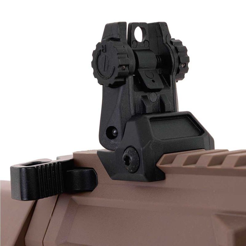As alças e massas de miras são ajustáveis e adaptável, podendo ser rebatida ou removida caso queira utilizar uma mira holográfica.