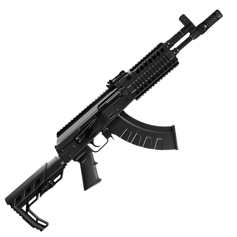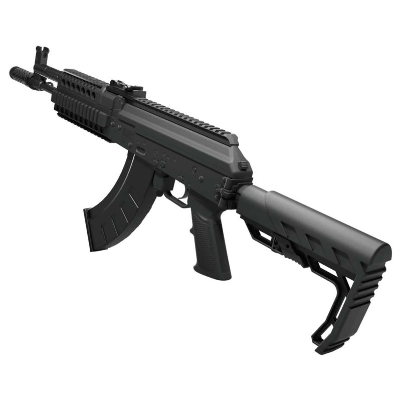 Possui coronha rebatível em seis posições diferentes, imitação de supressor embutido e trilho de 22mm quad-Weaver / Picatinny na parte superior e no handguard — ótimo para colocar Red Dots, Lunetas, Bipé, Mira Laser e Lanternas Táticas.