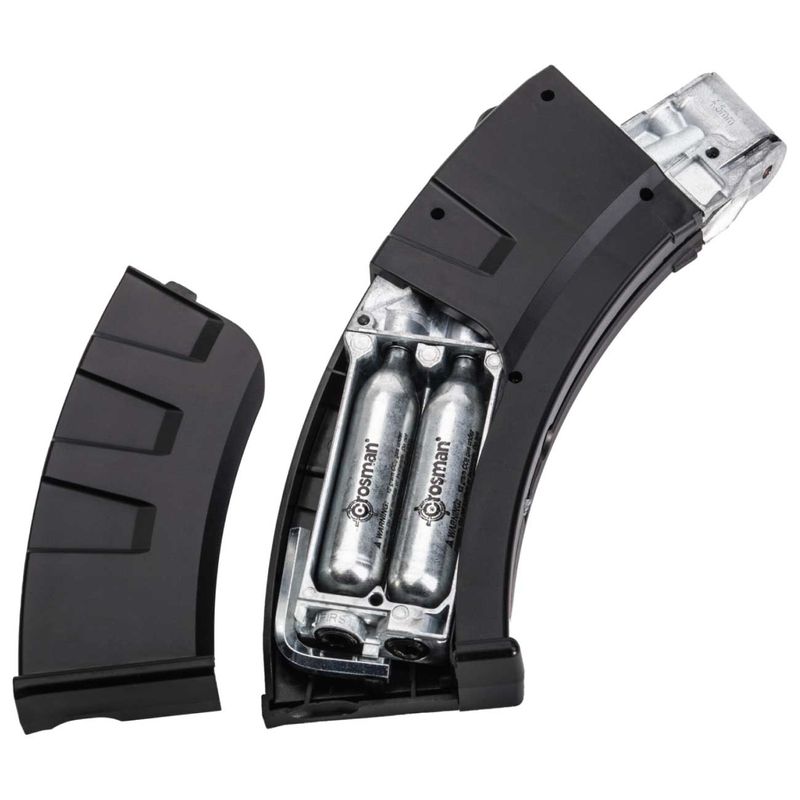 Este rifle Crosman AK1 AK47 utiliza dois cilindros de CO2 12g no magazine e dispara esferas de aço calibre 4,5mm (.177) a uma velocidade superior a 430fps.