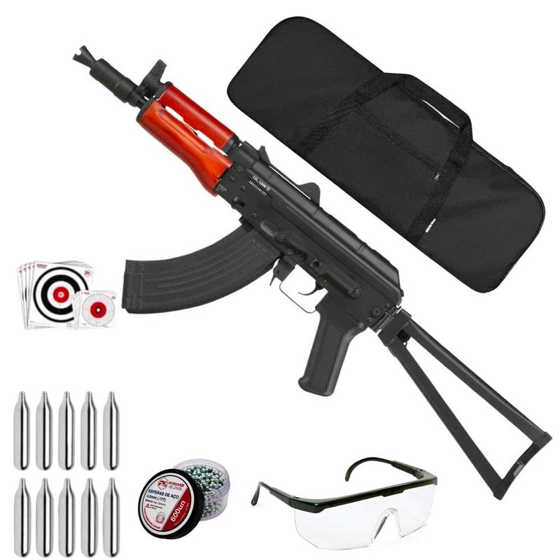 O rifle Airgun AKS-74U Kalashnikov CO2 possui uma energia de disparo médio de 3 joules e disparos no modo Semi Auto, rendendo mais de 70 disparos com um cilindro.