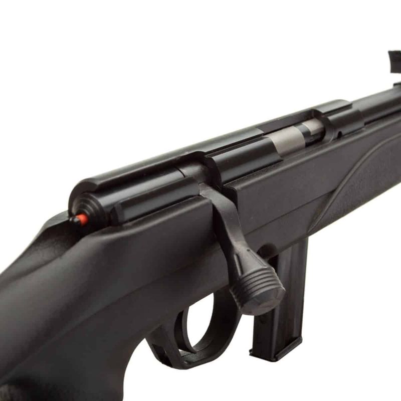 O rifle CBC 8122M Bolt Action possui o corpo em polipropileno com reforço de fibra de vidro na cor preta possuindo um peso de 2kg.