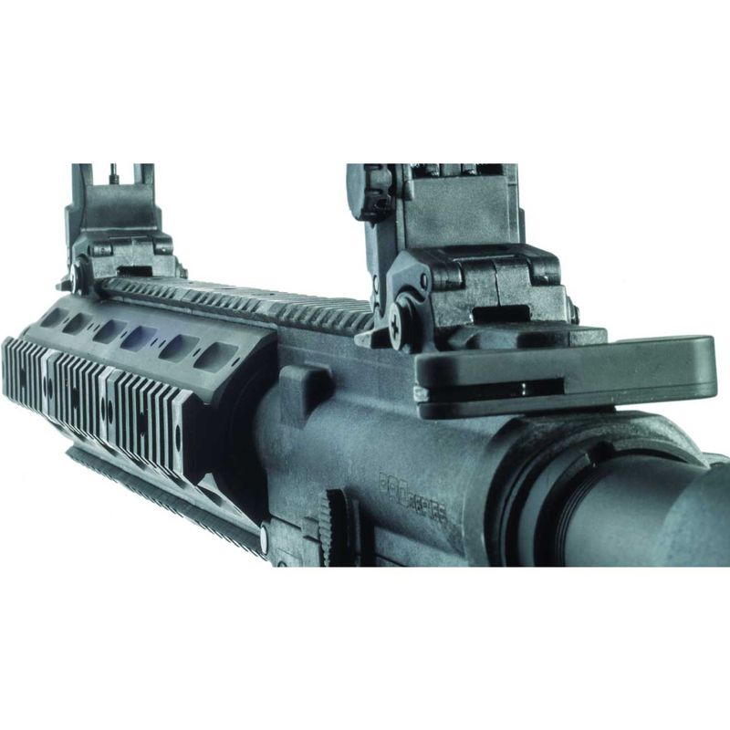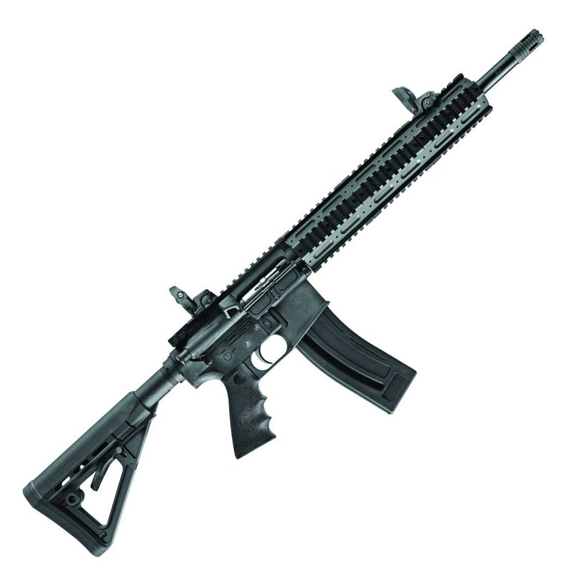 A carabina MFour-22 Gen-III Pro vem com um cano parkerizado de 16 polegadas com perfil Match e ocultador de flash removível