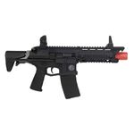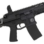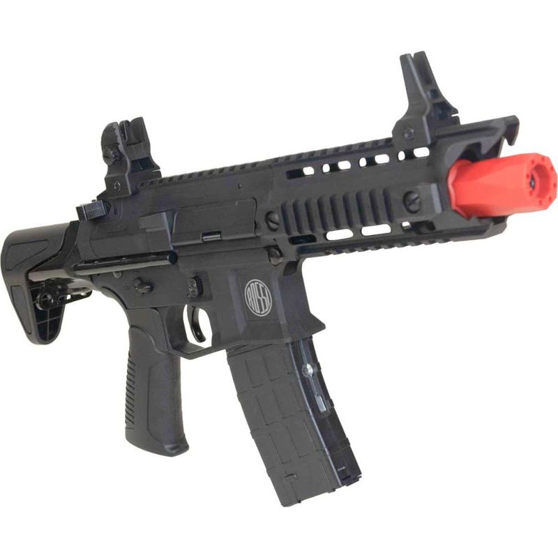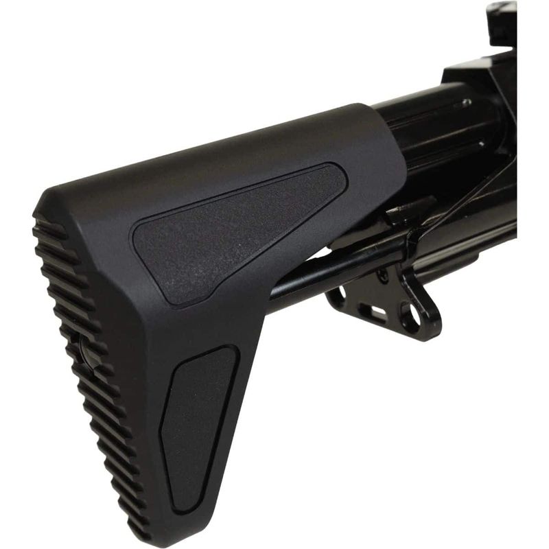 Sua construção combina fibra de nylon de alta resistência, peças metálicas, trilhos padrão Picatinny de 22mm, coronha retrátil tipo PDW e Handguard RIS que permite a instalação de acessórios táticos como red dots, lanternas, grips e muito mais. A ergonomia é complementada por alça e massa de mira rebatíveis.