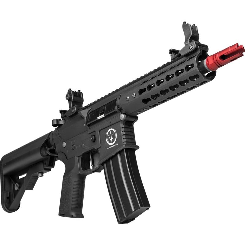 A construção em fibra de nylon garante leveza e resistência, enquanto o cano em metal reforça a durabilidade do conjunto. O handguard no padrão KeyMod, com 6,5 polegadas de comprimento, oferece ampla possibilidade de customização com acessórios compatíveis. O trilho Picatinny de 22 mm permite a instalação de miras ópticas, red dots e outros dispositivos.