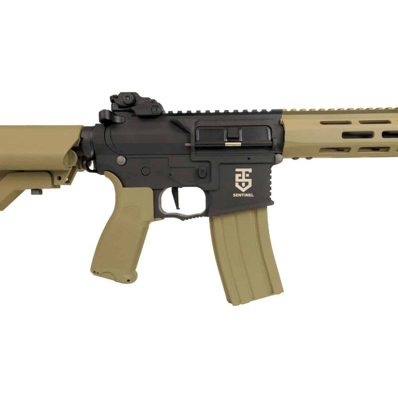 O Rifle Sentinel 10" M-Lock TAN possui cano de 10 polegadas de comprimento, mas o que mais impressiona é sua construção com corpo em polímero, trilho superior em polímero de 20mm para miras óticas (Red Dot) e massa e alça de mira em polímero, rebatíveis.