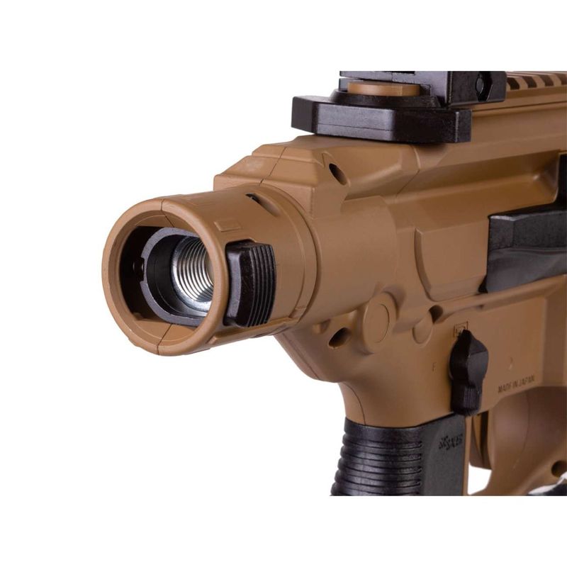 Este rifle de ar apresenta uma coronha durável em polímero nas cores terra escura e preto, com um receptor de metal e componentes que remetem à plataforma AR, conferindo-lhe uma sensação robusta e funcional.
