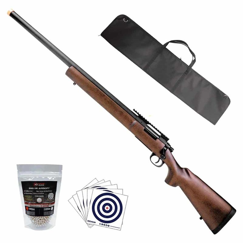 O Rifle Sniper Airsoft Rossi M24 Storm Wood Spring 6mm Kit dispara no modo Repetição (Ferrolho) com velocidade de 400fps - 121m/s e energia de 1,5 Joules Ver mais