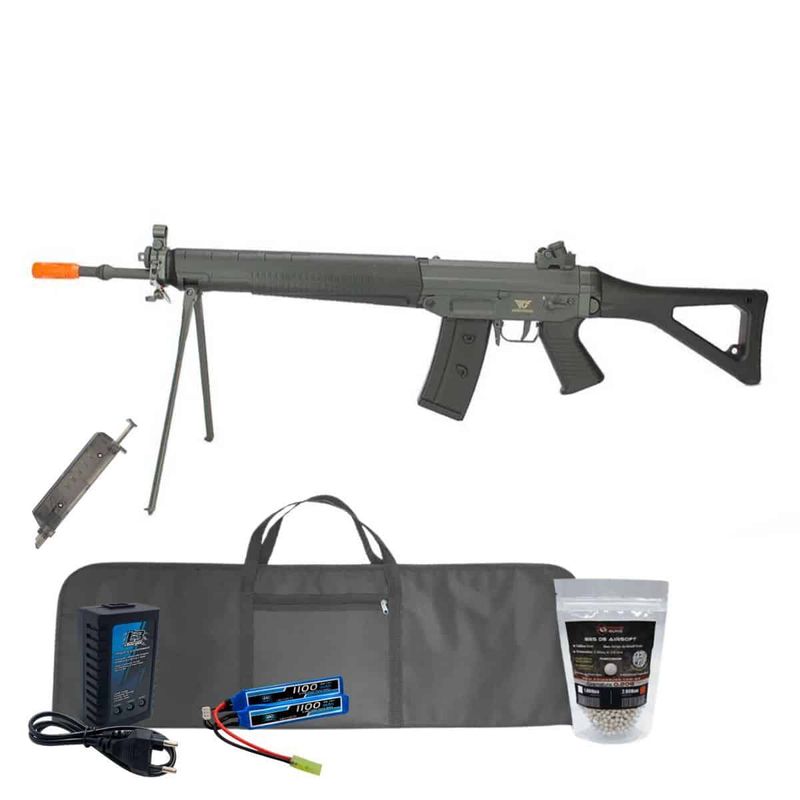 + Carregador L3 + 2.000 BBs de Airsoft + Bateria Lipo 7.4 1100mAh + Capa com forro + SpeedLoader 90 BBs