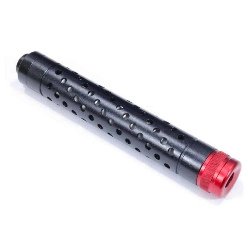 Feito em alumínio anodizado e com acabamento na cor preta. Muito útil para auxiliar na proteção do cano, principalmente canos de precisão, os supressores fakes chegam a diminuir o barulho em até 10% devido a retenção de ar no cano.