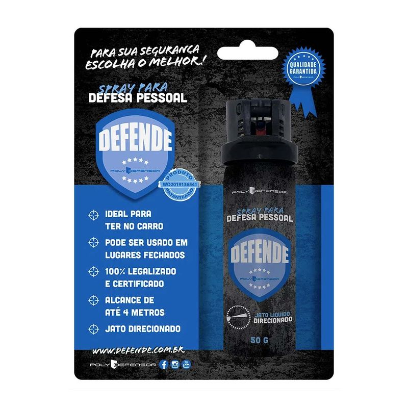 Spray de Defesa Defende Direcionado 50g O Spray Defende Direcionado da Poly Defensor é ideal para ter no carro. Tem como objetivo imobilizar o agressor para se evadir do local e/ou chamar a Autoridade Policial.