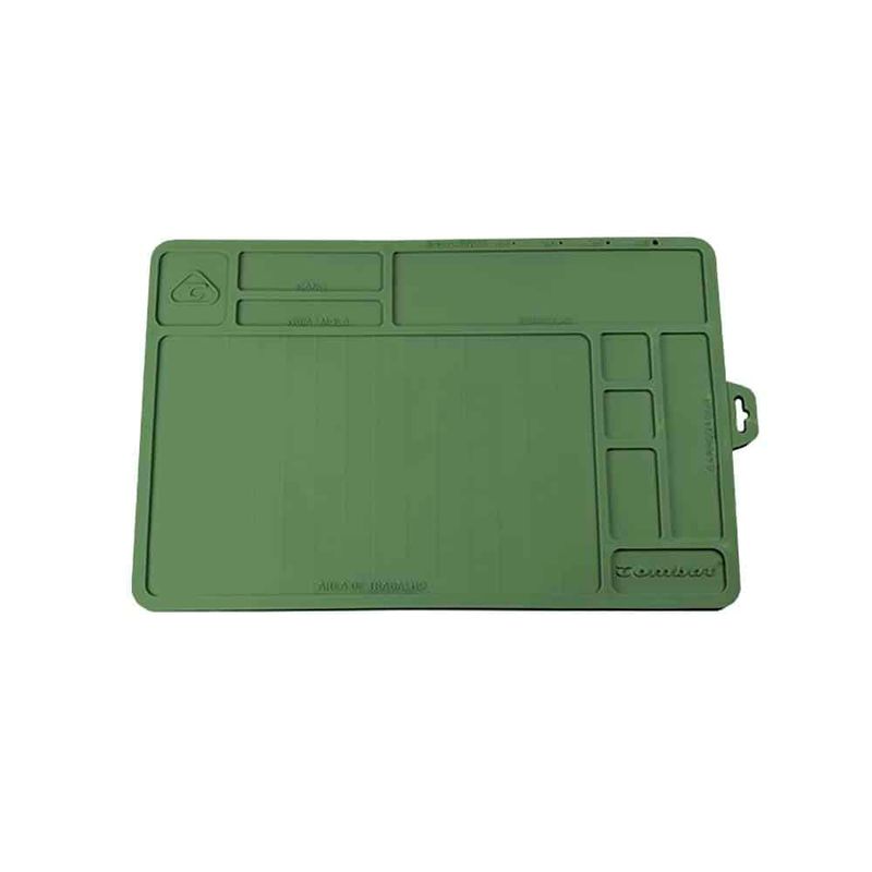 Os compartimentos do tapete são devidamente separado para ajudar na organização das peças e ferramentas. A base emborracha possui um alto poder antiaderente inédito através do exclusivo sistema de colmeias.