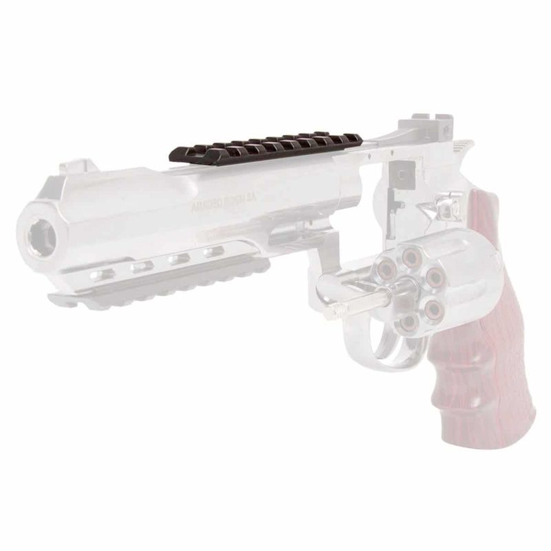 Como muitos modelos não acompanham o trilho superior, essa peça universal permite que você instale o trilho nos modelos padrão maiores de 4" de cano da Rossi, Gamo, Crosman e Dan Wesson.